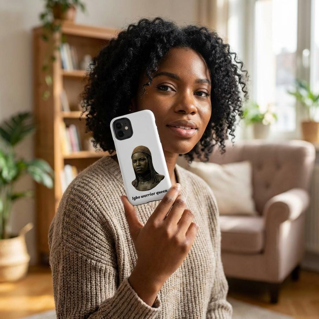 Featuring a striking bronze-toned portrait on a clean white background with the phrase “Igbo Warrior Queen”, this Afrocentric phone case is more than protection — it’s a statement of resilience, pride, and feminine strength.